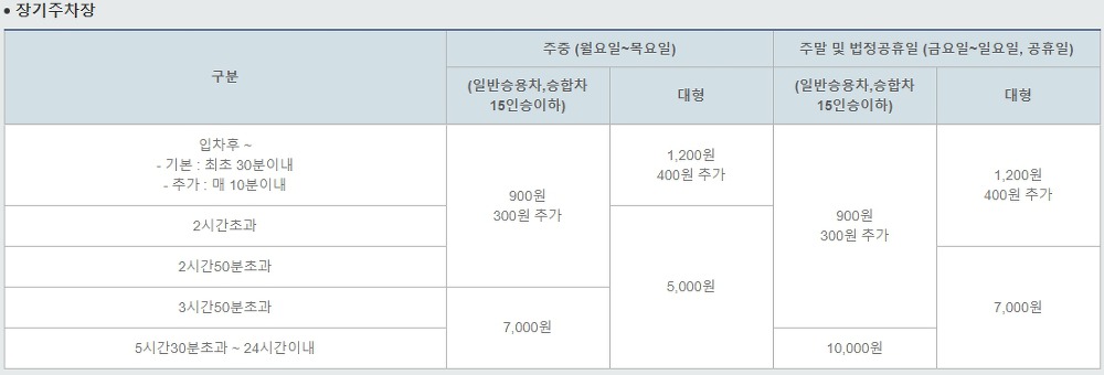 - 장기주차장 요금은 주중에는 1일 기준 7천 원, 주말 및 공휴일에도 1만 원